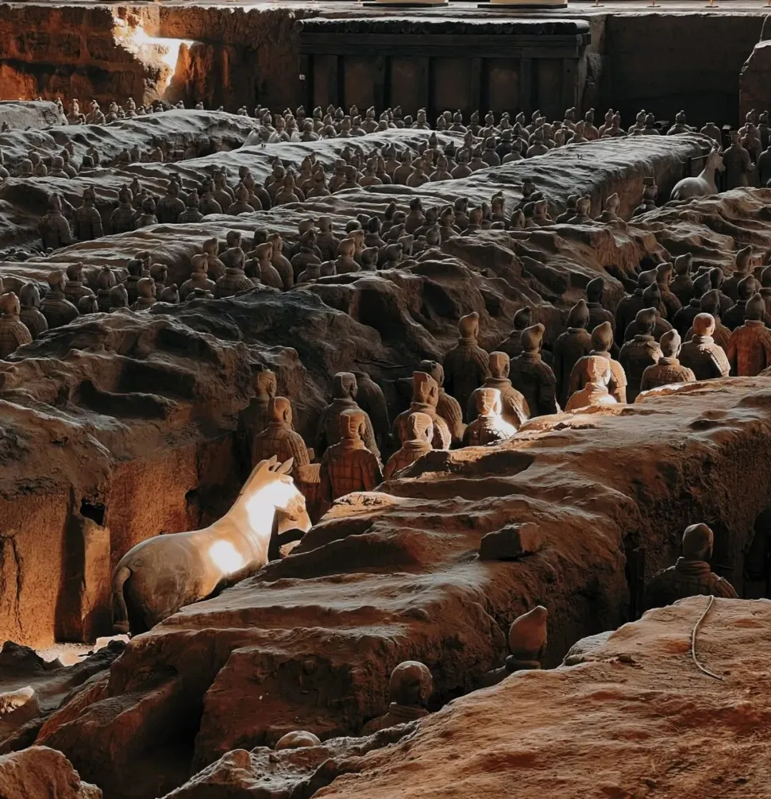 秦始皇陵的陪葬坑,出土千余个形态各异的陶俑,展现两千年前秦朝的雄浑气势,被誉为“世界第八大奇迹”。