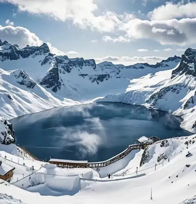 十六座山峰簇拥的火山湖,湖水深邃幽蓝,传说首次见到天池的人会收获美好祝福。冬日的长白山,皑皑白雪覆盖着山峰,云雾缭绕间,仿佛置身仙境。
