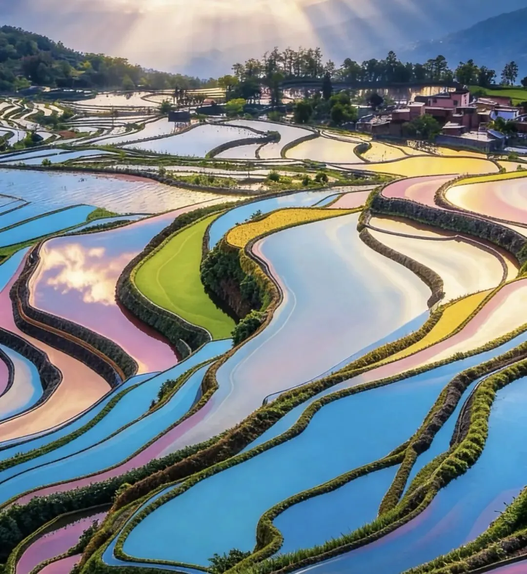 哈尼族人千年劳作形成的梯田景观,层层叠叠的水面倒映天空与山川,如彩色玻璃般精美,是世界文化遗产。