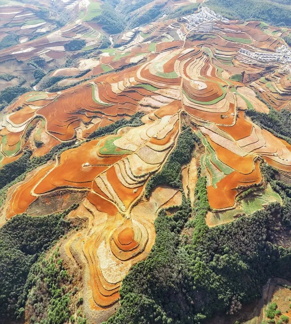 因土壤中铁铝氧化形成赤红色彩,田地与农作物分割成色块,与蓝天白云相映成趣,宛如大地调色盘。