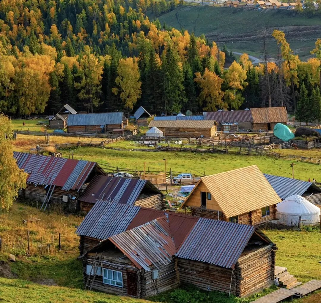 新疆阿勒泰山脚下的童话村庄,原木小屋错落有致,秋季白桦林金黄灿烂,炊烟袅袅如世外桃源。