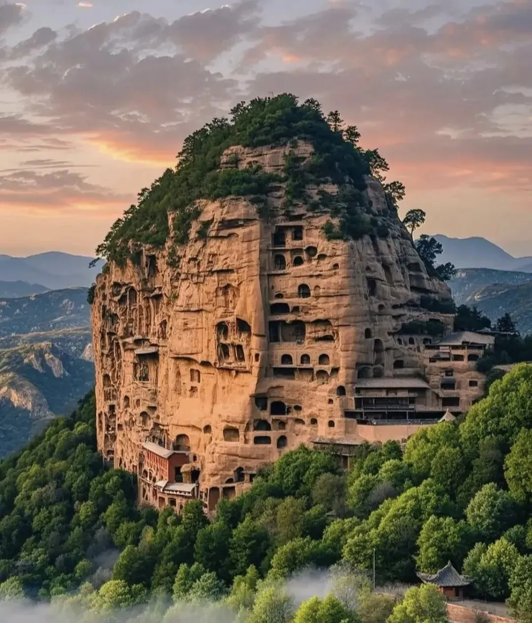中国四大石窟之一,佛像与壁画精美绝伦,悬挂在90°垂直的悬崖峭壁上,被誉为“东方雕塑艺术陈列馆”。