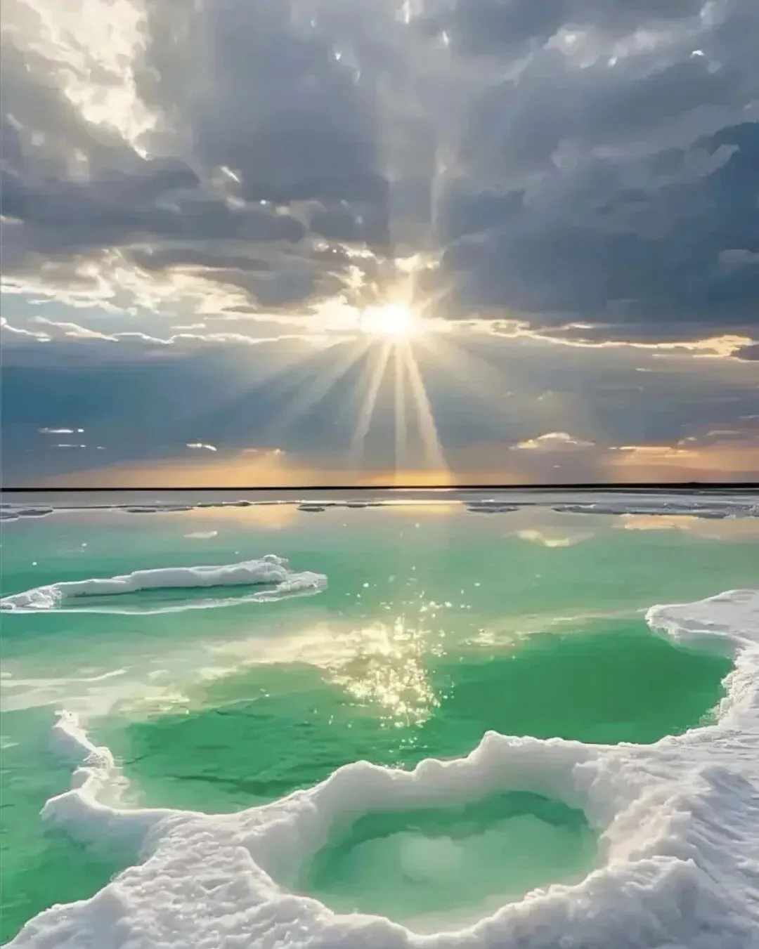 六、运城盐湖盐晶凝结成雪白的花边,将斑斓的湖水框成精致的画,光脚踩在盐滩上,粗粝的触感混着湖水的微凉,是独属于盐湖的浪漫