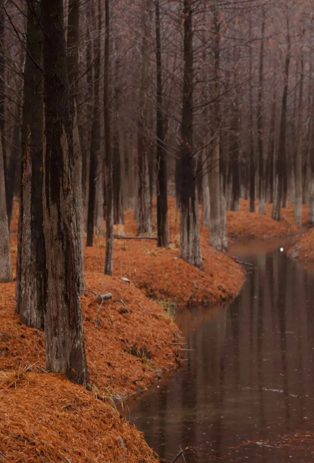笔直的杉树列队而立,红褐色的针叶簌簌落下,在水岸铺成厚软的绒毯,踩上去沙沙作响,是林间独有的私语
