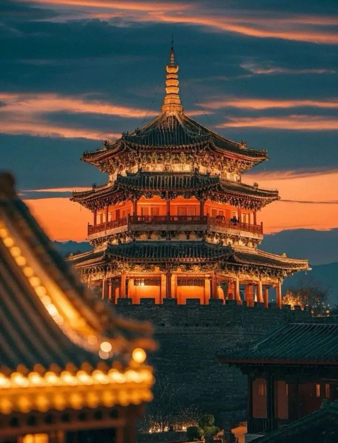 十、正定古城日落时分,橙红霞光漫过飞檐翘角,青砖黛瓦在光影里晕开岁月的温柔