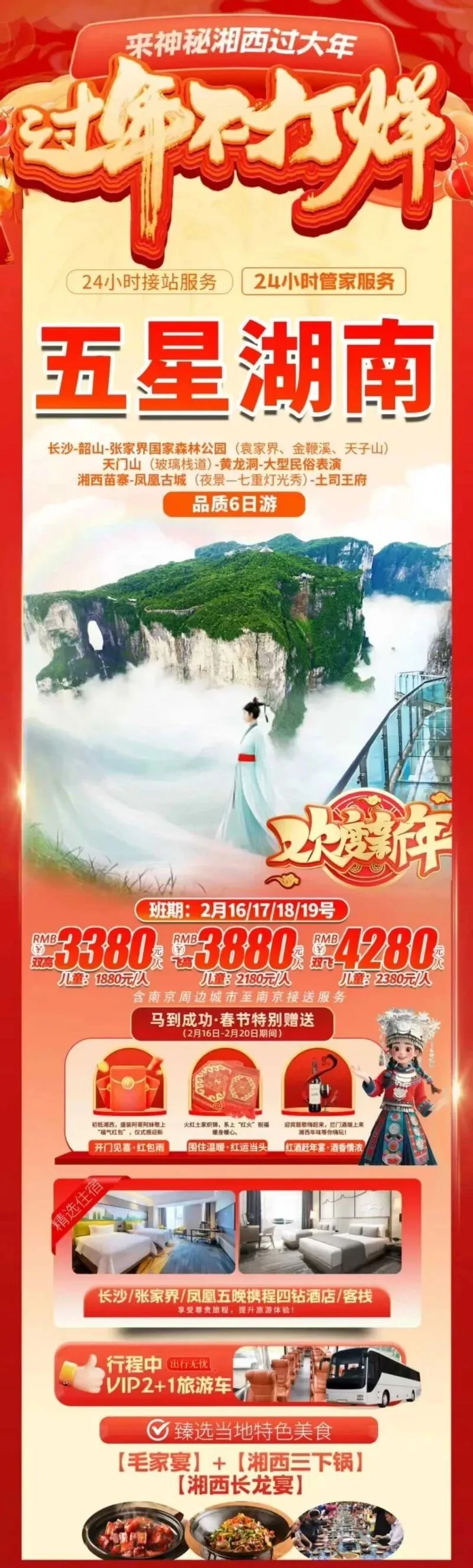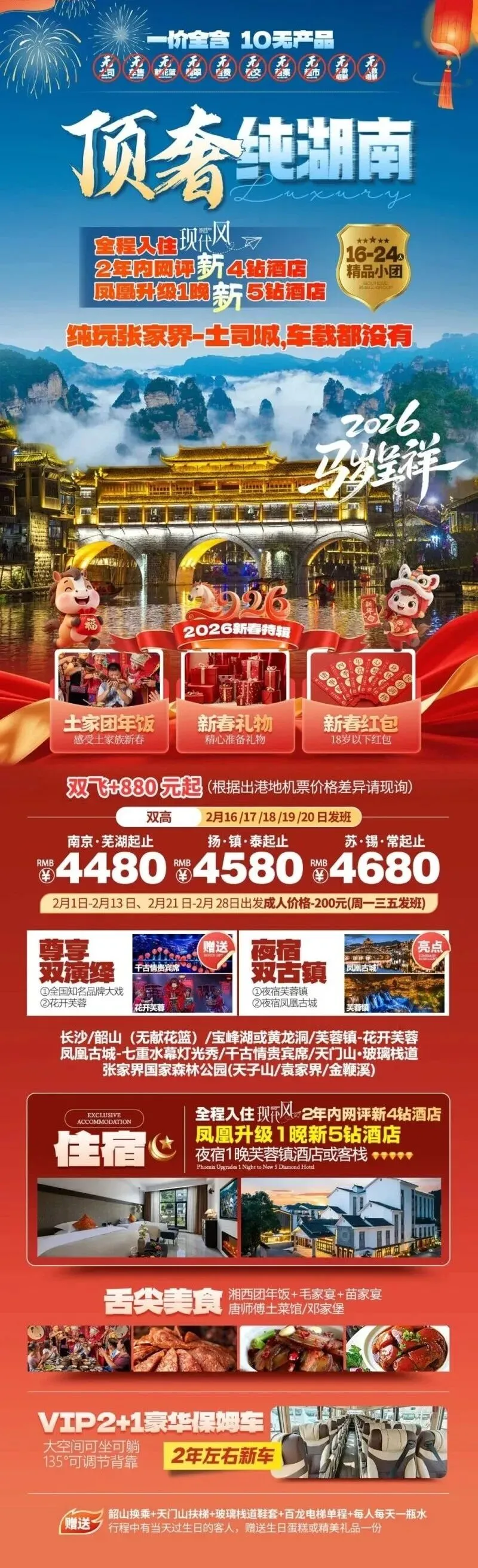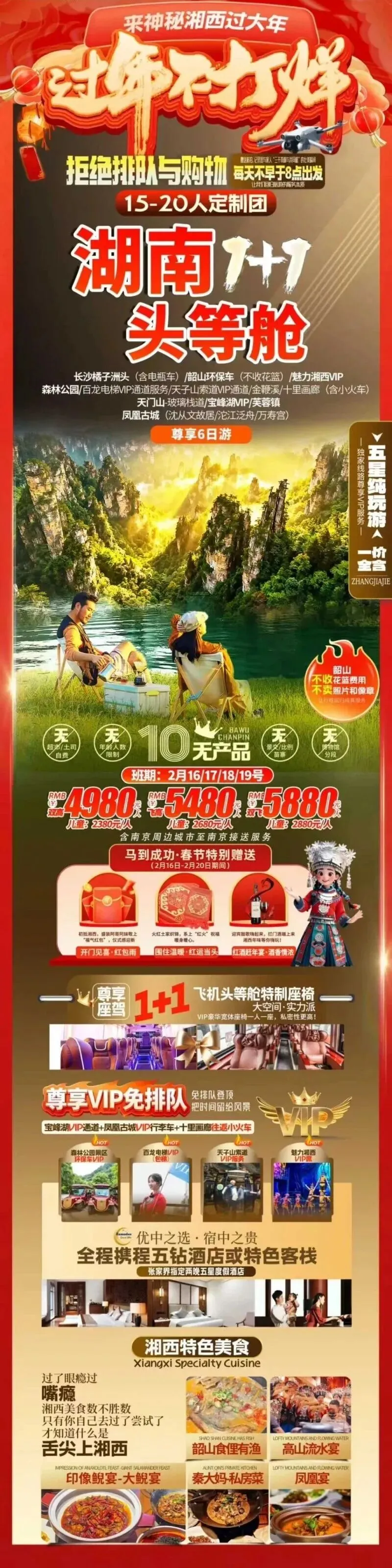 春节2月16/17/18/19号《湖南1+1头等舱》15-20人团
