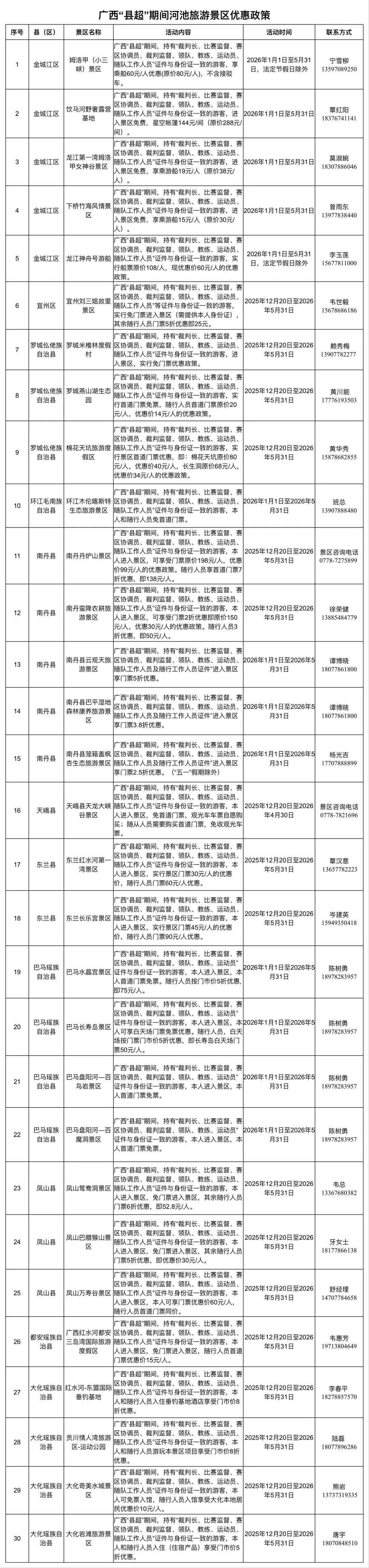 2026年1月至5月,广西“县超”期间,河池30家旅游景区景点在首道门票、住宿消费上推出不同折扣的优惠活动。具体如下: