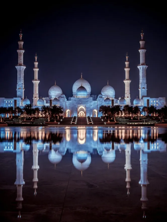 阿布扎比的谢赫扎耶德大清真寺洁白肃穆,内部装饰华丽,展现伊斯兰建筑的震撼之美。