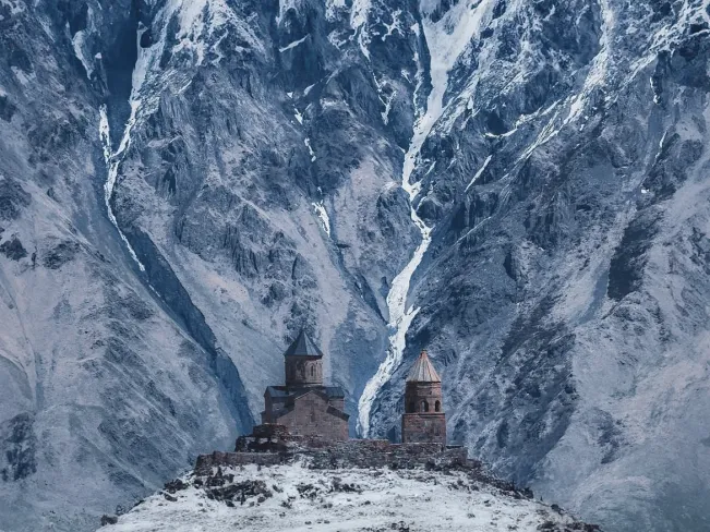 格鲁吉亚的卡兹别克山终年积雪,山脚下的圣三一教堂矗立在悬崖上,仿佛悬浮在云端,能欣赏到雪山与森林的绝美风光。