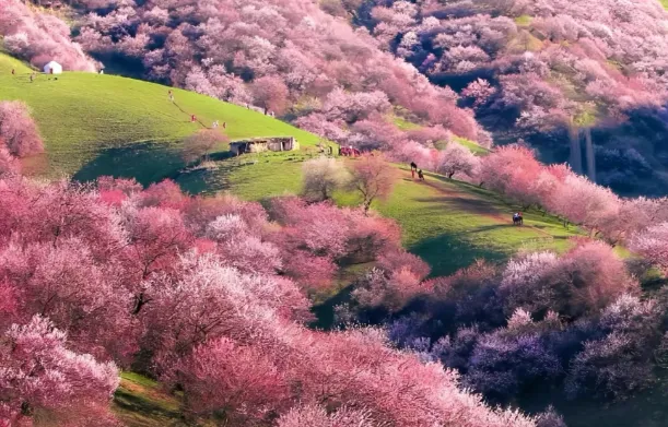 杏花沟位于新疆伊犁州,以其杏花盛开的美景而著名。每年春季,漫山遍野的杏花绽放,景色壮观,还能品尝到当地特色的杏子美食。