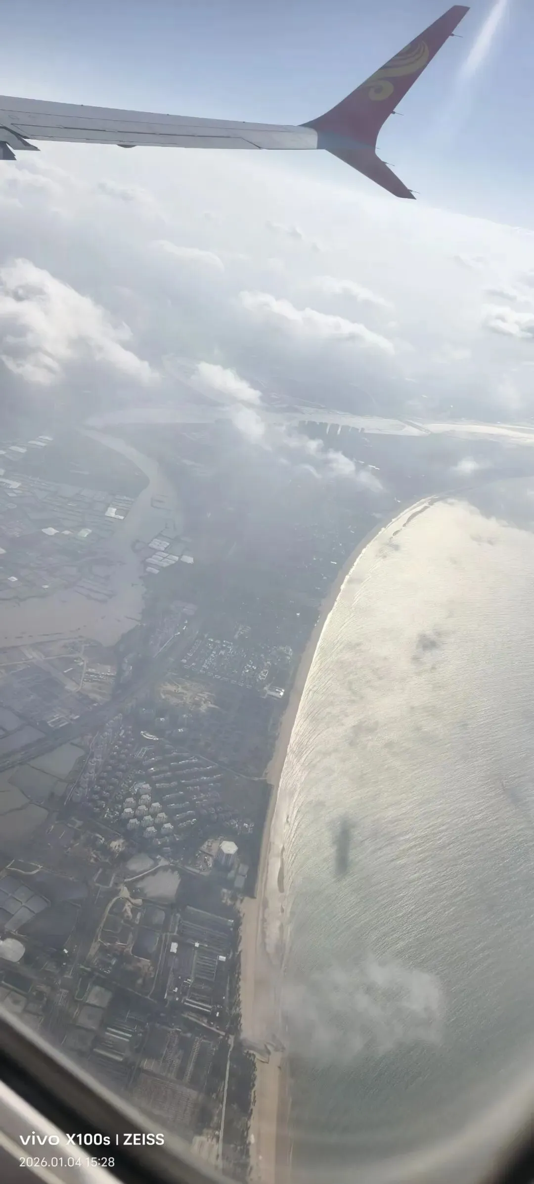 15:21分飞机在下降,有透漏出地面陆地与大海的海岸边际线,云在向后飞,估计在海拔3000米。又在下降,又平飞。下面是海,海里的船可见。又在下降,一刻钟后将到达美兰机场。