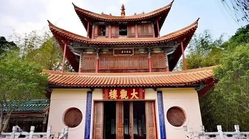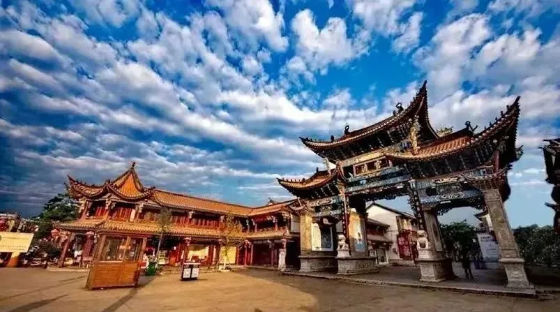 大观楼,位于大观公园内,为三重檐琉璃戗角木结构建筑,平面呈方形,四周设有月台,月台周边为石灰岩方整石所砌,西面有长廊相连,因一对长联而闻名于世。很多人以为先有大观楼,后有大观公园,其实不然,公园始建于明朝洪武元年,到了清朝康熙二十九年,时任云南巡抚王继文主持兴建了大观楼,此后,公园也因楼得名。最初的大观楼只有两层,到了道光八年重新修葺,增建为三层。咸丰三年时,咸丰帝亲题“拔浪千层”匾,然而咸丰七年,整个大观楼毁于战火。同治年重新修建,随后却又遭大水冲毁。今天我们看到的大观楼,是光绪九年再次重修,距今130多年历史。大观公园内有大观楼、近华浦、盆景园、乾印堂、揽胜阁、观稼堂、催耕馆、涌月亭、牧梦亭、彩云崖等多处景点,完美展现了中原文化与边疆文化融合的特色。上联「五百里滇池奔来眼底,披襟岸帻,喜茫茫空阔无边。看:东骧神骏,西翥灵仪,北走蜿蜒,南翔缟素。高人韵士何妨选胜登临。趁蟹屿螺洲,梳裹就风鬟雾鬓;更苹天苇地,点缀些翠羽丹霞,莫辜负:四围香稻,万顷晴沙,九夏芙蓉,三春杨柳。」下联「数千年往事注到心头,把酒凌虚,叹滚滚英雄谁在?想:汉习楼船,唐标铁柱,宋挥玉斧,元跨革囊。伟烈丰功费尽移山心力。尽珠帘画栋,卷不及暮雨朝云;便断碣残碑,都付与苍烟落照。只赢得:几杵疏钟,半江渔火,两行秋雁,一枕清霜。」10、官渡古镇