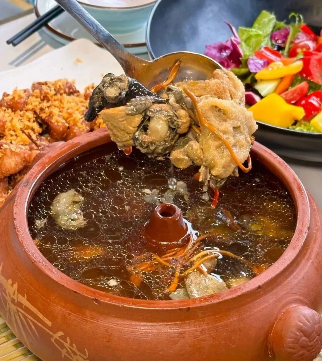 其精髓在于滚烫高汤——以老母鸡、火腿、猪骨慢熬而成,汤清味浓。食用时将生肉片、鹌鹑蛋、蔬菜等配料依次倒入热汤中烫熟,最后加入滑爽米线。讲究“先荤后素”,汤鲜、料足、米线弹牙,一碗下肚暖胃又满足,是云南人宴客与日常饮食的灵魂之选。