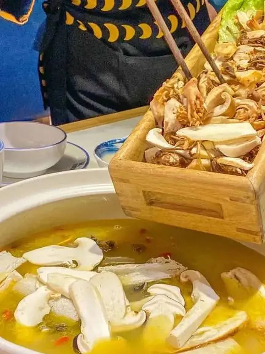 每年6月至11月,云南进入野生菌盛宴季,野生菌火锅便成为餐桌主角。以土鸡或猪骨熬汤为底,加入牛肝菌、鸡枞、松茸等十余种山野鲜菌同煮,汤头清香醇厚,菌肉滑嫩鲜美。此菜不仅体现云南“靠山吃山”的饮食智慧,更是一场舌尖上的自然馈赠,错过便需再等一年。