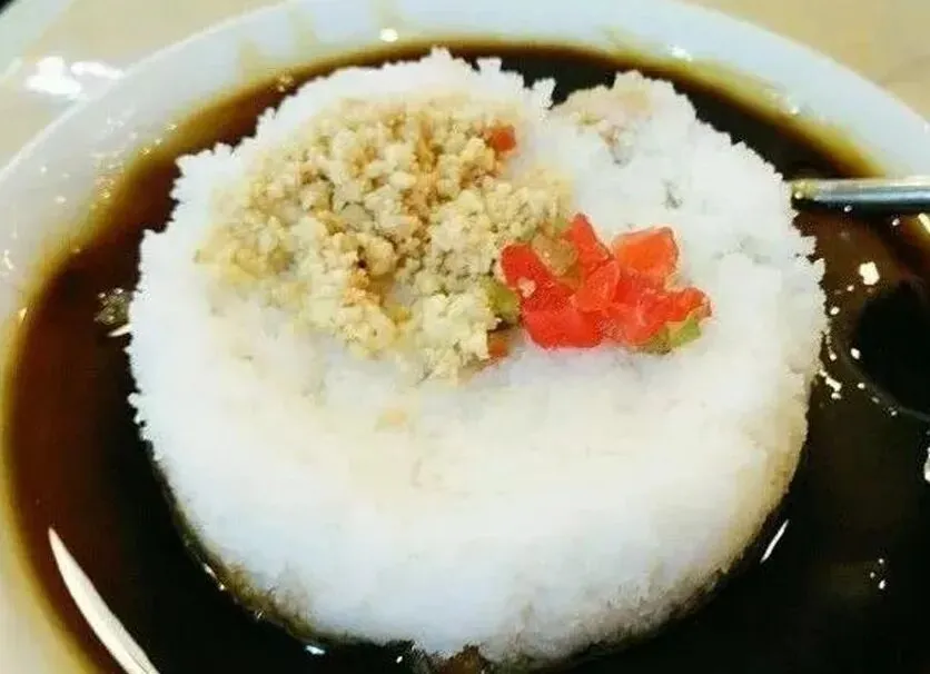 调糕藕粉是老昆明人心中的怀旧甜品,由藕粉与蒸米糕巧妙组合而成。冲调后的藕粉呈琥珀色,清香滑润;米糕软糯微弹,置于其上,再淋玫瑰糖浆、红糖水,撒芝麻、松子、葡萄干。食用前需搅拌均匀,口感甜润清爽,花香与米香交织,既有古法匠心,又有市井温情。