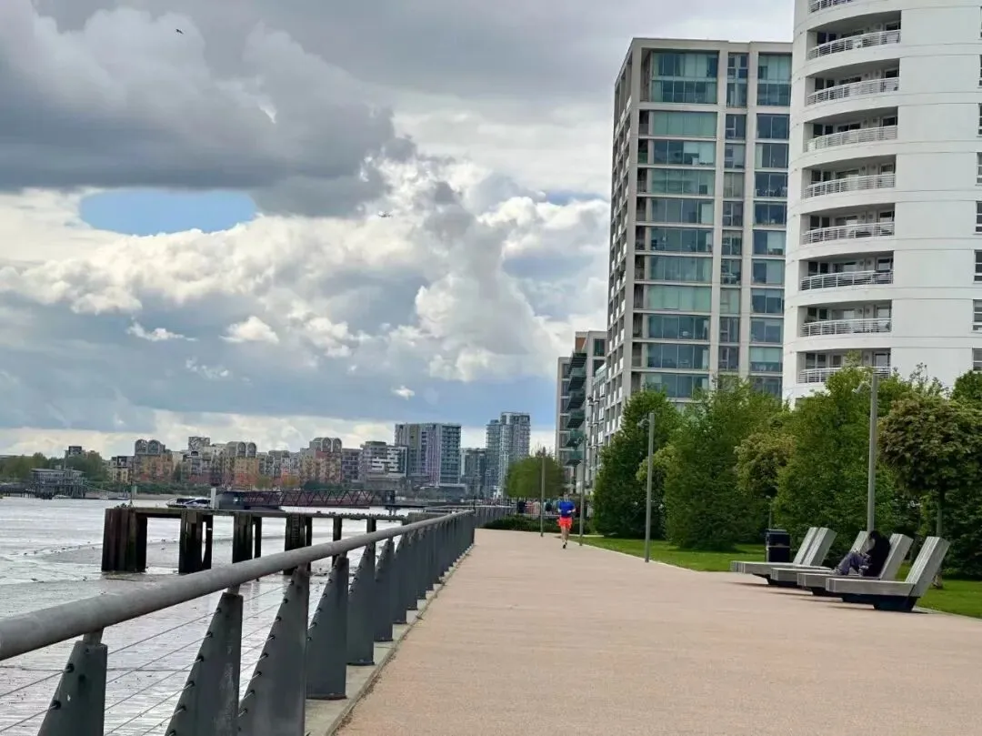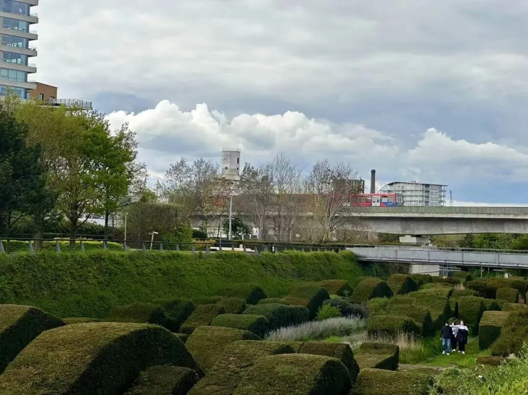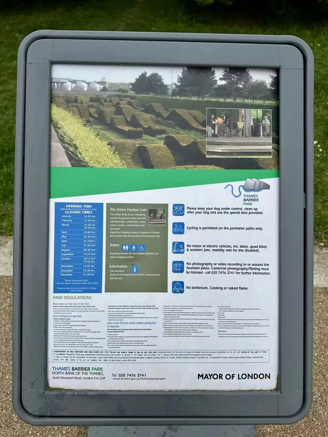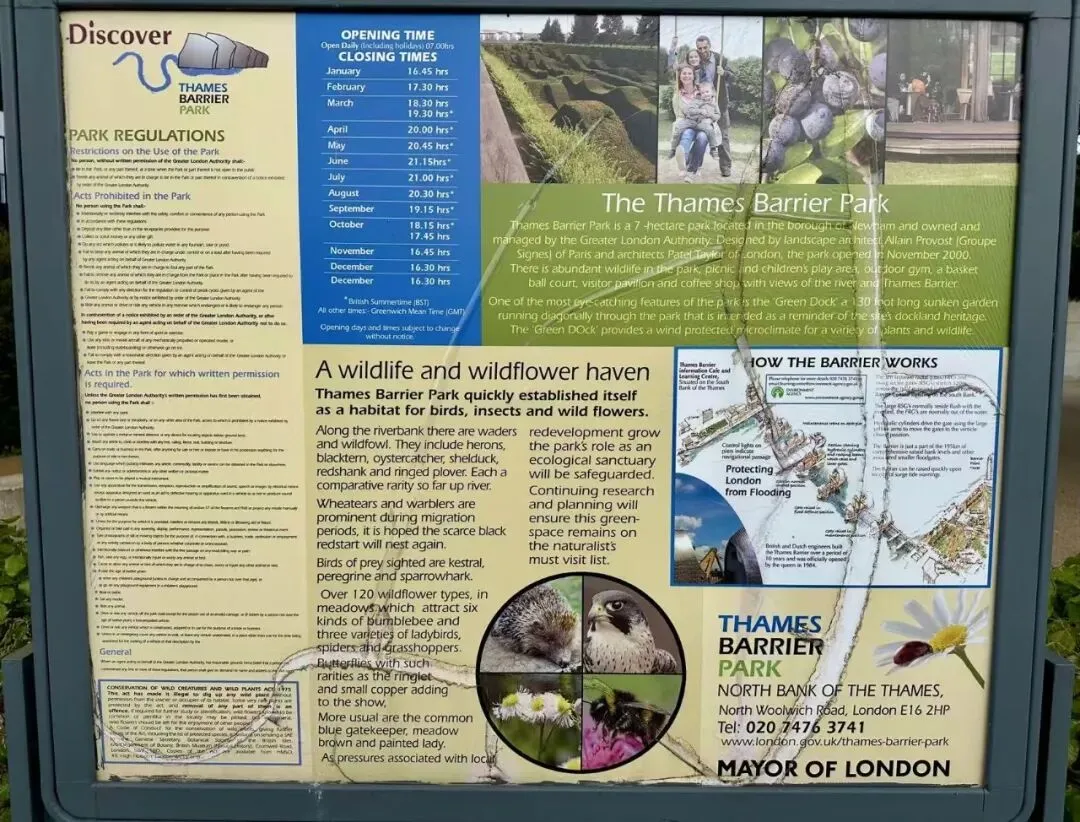 伦敦最被低估的景点:The Thames Barrier (泰晤士河防洪闸)提起伦敦知名的景点,大多数人首先想到的很可能是大本钟、伦敦眼、白金汉宫、塔桥、伦敦塔、圣保罗大教堂及各大博物馆等等这些耳熟能详的名胜古迹。其实,伦敦还有一个鲜少有游客光顾的景点,那就是位于东伦敦泰晤士河上的防洪闸。 泰晤士河防洪闸总长度大约520米,是世界上最大的可移动防洪闸之一。英国著名媒体《泰晤士报》(The Times)把泰晤士河防洪闸评为伦敦最被低估的景点。 泰晤士河防洪闸公园(The Thames Barrier Park)则是一处融合现代工程奇迹与自然美感的公共空间。紧邻著名的泰晤士河防洪闸,是伦敦近年来最具代表性的滨河景观公园之一。这里不像伦敦的八大皇家公园那样广为人知,却以其独特的地理位置、现代景观设计和深厚的城市背景,吸引着那些真正愿意探索、感受伦敦这座城市的人们。 公园的存在,首先离不开泰晤士河防洪闸这一宏伟的工程。历史上,泰晤士河多次洪水泛滥。防洪闸建成于20世纪80年代,是英国最重要的水利工程之一,是为了应对北海风暴潮和潮汐洪水对伦敦市中心造成的威胁而耗费巨资修建的。 这座银白色的闸门横跨河面,线条简洁流畅,外形硬朗富有力量感,既是工业文明的象征,也是一道守护城市安全的屏障。泰晤士河防洪闸公园正是在这样的背景下诞生,它并非简单的附属工程,而是试图用景观设计重新连接人、河流、现代工程与城市。 第一次来到这里,会有些异样的感觉:它并不是传统印象中那种绿树成荫、参天大树比比皆是,曲径通幽,精致典雅的英式公园。在这里,看不到那些名贵的花草树木,也没有人工修剪的大片花海。而是一处线条清晰明朗、气质冷静,却又耐看、耐走的城市空间。 沿着入口进入公园,视野很快被一条笔直而开阔的绿色通道吸引,就像是一道被精心雕刻出的“绿色峡谷”。这种几何感极强的设计并不刻意追求柔美,却自有一种秩序和韵律之美。据说这种设计并非只是单纯追求视觉效果,而是巧妙呼应了防洪主题,象征着水位变化和河流力量。行走其间,脚步会不自觉地放慢,视线也随之被引导向远处的河岸和防洪闸。 这里的日常气息同样令人着迷:有附近居民在河边慢跑;草地,长椅上三三两两坐着晒太阳的,看书的人;推着婴儿车散步的;还有遛狗的;孩子们在园中的游乐场开心地玩耍。这里不像市中心公园那样喧闹,却更像当地居民生活的一部分,安静而真实。 如果说伦敦的魅力在于层层叠加的深厚的历史、文化底蕴,那么泰晤士河防洪闸公园某种程度上则代表着一种城市面向未来的态度。