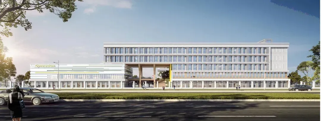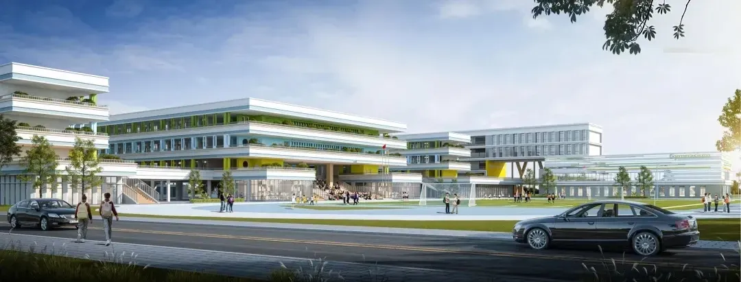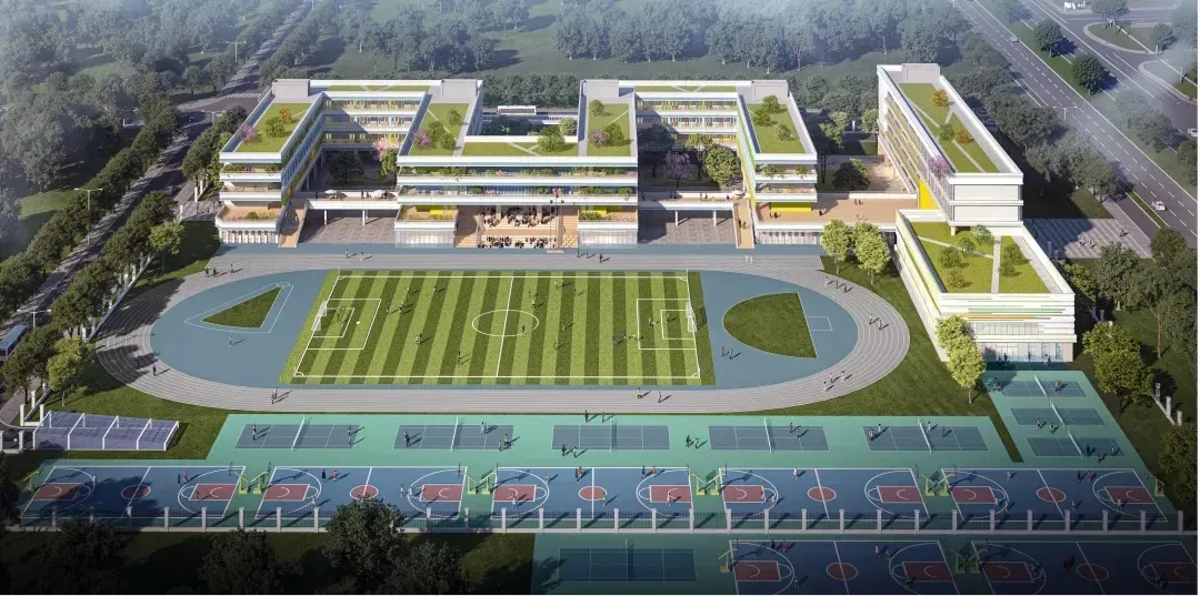校园中轴线由南向北贯通,建筑通过围合、并列、对景等组织手法将轴线分为几段,犹如一曲精心谱写的乐章,张弛有道。以功能区为分界,运动区主要集中在西侧,教学办公区集中在东侧,西侧依次设置300米环形操场、报告厅、图书馆、风雨操场,东侧由北向南依次为小学部教学楼、实验楼、中学部教学楼。