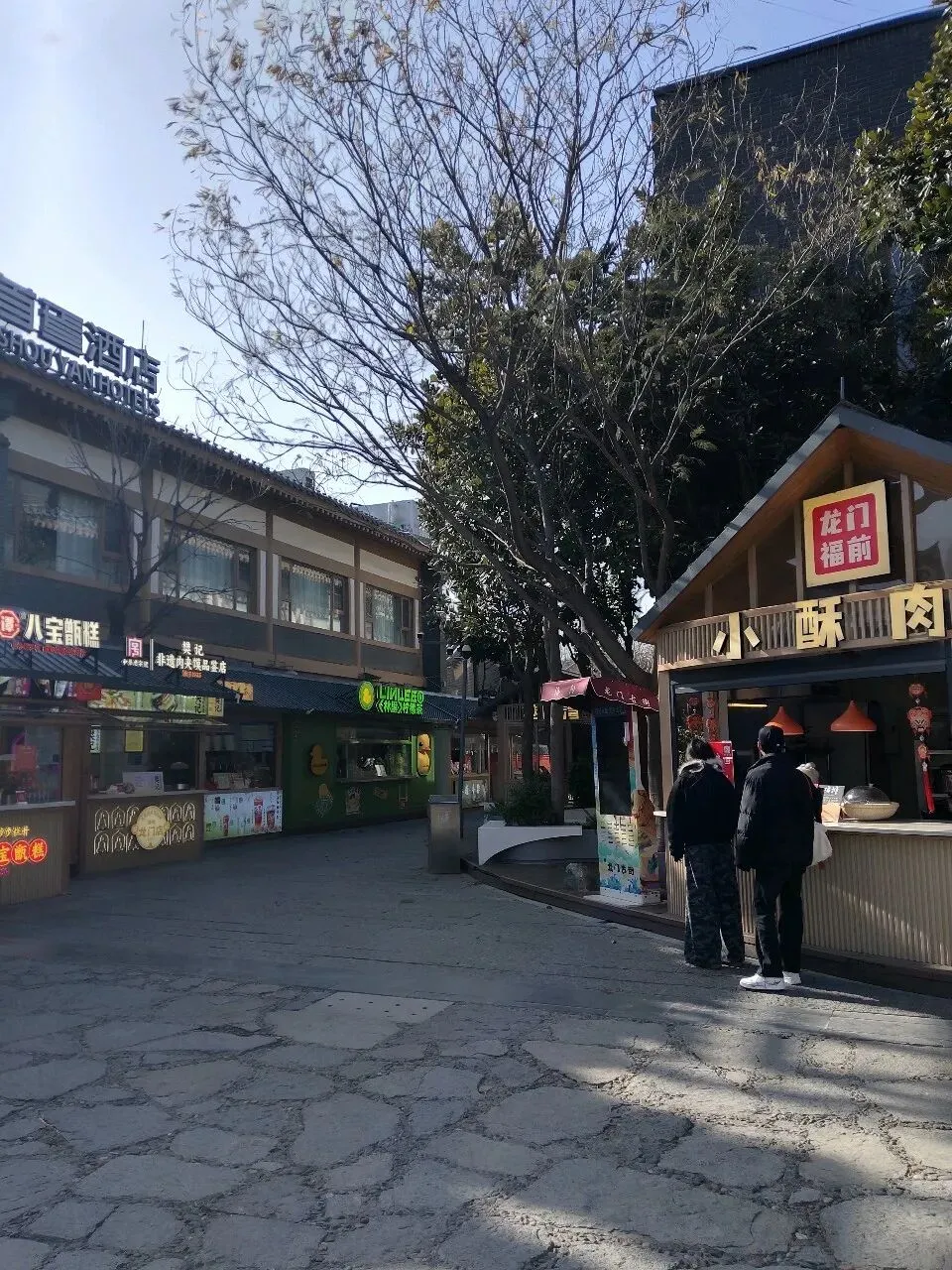 我们先是随着人流步行前往龙门石窟处,只见东边是护栏伊河,河水缓缓流淌,水质靛黄清澈,山水风光秀丽,不少游客站在伊河护栏边拍照。走进龙门大桥石拱门便是石窟地带了,石窟主要在龙门西山石壁上,密密麻麻窟龛块状布局。濒临东边伊河,河水在阳光照射下波光潋滟,山水倒影,相映成趣。河边与山脚下是道路,路面是青石纹板路,走得人多了,纹面磨得黝黑光亮。原来石窟河边是一排小商铺,道路狭窄拥挤,现在小商铺均已清除,石窟前道路宽敞,视野开阔。走在青石纹板路上,仿佛走进了千年前的时光里,令人遐迩冥想。
