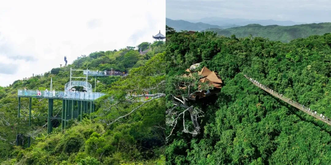 《非诚勿扰2》的取景地,是俯瞰亚龙湾全景的最佳位置。景区有全海景玻璃栈道,脚下是苍翠雨林与湛蓝海湾,惊险又出片;还有过江龙索桥,感受高空漫步的浪漫。2025年新增雨林栈道,可近距离观赏热带植被。
