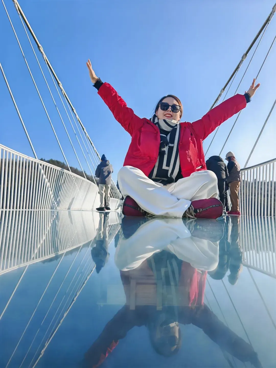 特色项目玻璃桥:世界首座斜拉式高山峡谷玻璃桥,全长430米,宽6米,桥面距谷底约300米,桥面全透明玻璃铺设,是全球最高的玻璃桥之一,还设有世界最高的蹦极台和最陡的滑索台。