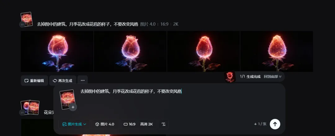 打开即梦AI,选择图片生成,生图模型选择新出的4.5 提示词输入 :全景,上下左右留空,一朵由星光粒子构成的月季花(有茎秆和叶子),流畅,闪耀,科技,花瓣中心是微缩效果的北京地标建筑,故宫,天坛,中国尊,鸟巢,这些建筑聚在一起,在花朵的中央形成一个整体,这些建筑轮廓是科技感的发光线勾勒,花瓣为浅红色通透粒子构成,背景为纯黑色。无文字