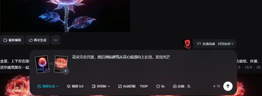 切换至视频生成界面,模型3.0,分别上传刚刚的2张图进行首尾帧视频生成点击生成,生成一镜到底的视频