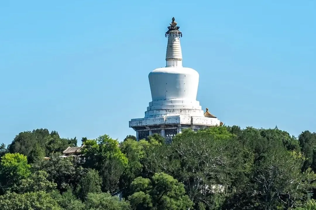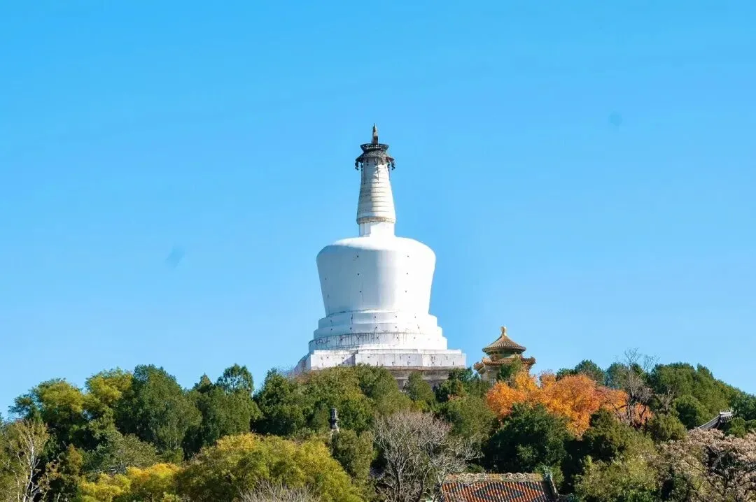 琼华岛白塔:09:00前顺光,仰拍显挺拔,配红墙绿树更出片;