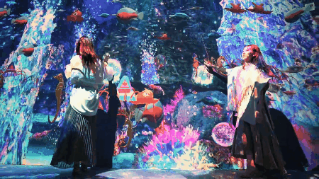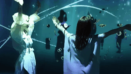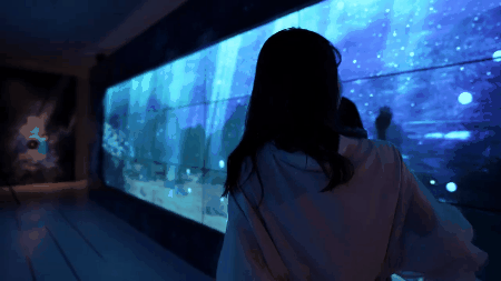 由各种颜色的鱼集群而成的水下奇迹,庞大的鱼群开始不断移动,游客的身影变成鱼再与之展开互动,和鱼群一起畅游深海。