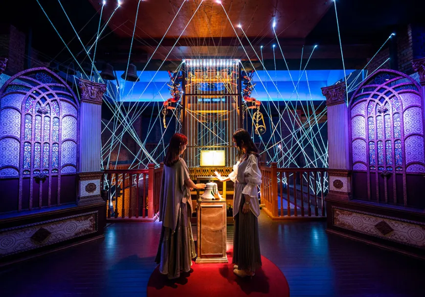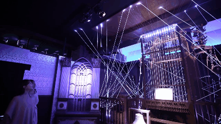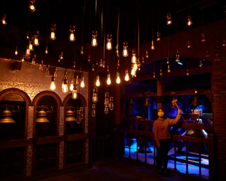此外,还有一个高达9m的宏伟钟琴装置。当你走进触发装置时,一场钟琴与灯光的大秀将震撼上演,在光影中古朴、沉稳、大气。