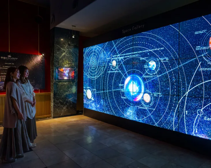 “宇宙幻想曲”由太空画廊、控制室以及光之星系组成。宇宙飞船中的AI系统已经做好陪游客进入外太空的准备。在“时空画廊”中研究收集的数据,再通过安装在飞船上的AI系统处理后为银河之旅做准备。