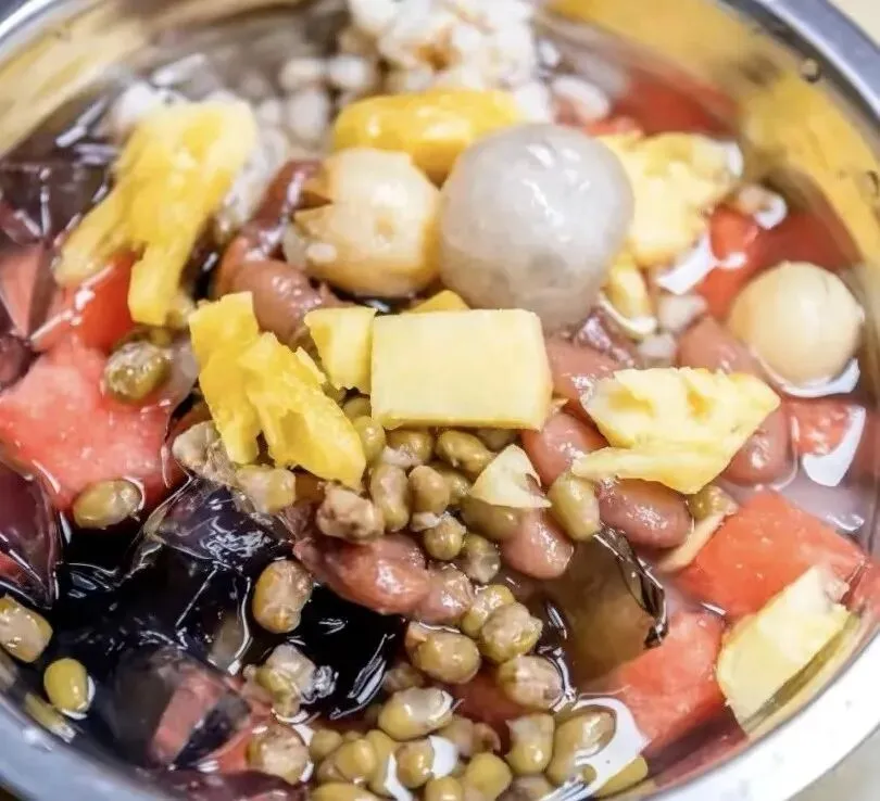 四果汤是流行于福建漳州、泉州一带的特色甜品,有着清凉解毒,甜美爽口的特征,里边的食材特别丰富,有芋头、仙草冻、红豆、莲子、绿豆、薏米、西瓜等,吃到嘴里酸酸甜甜的,细腻爽滑,是当地夏季消暑的重要饮品。