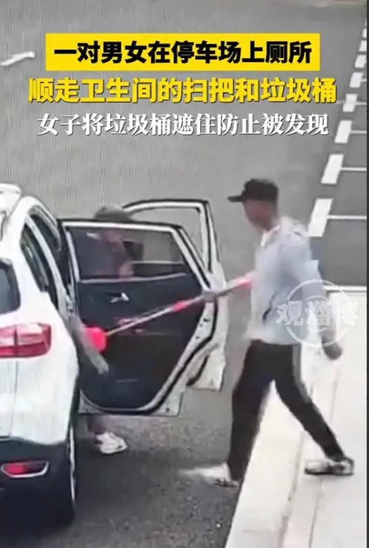 之后,男子见四下无人,快速将公厕里面的拖把塞到了车后座。