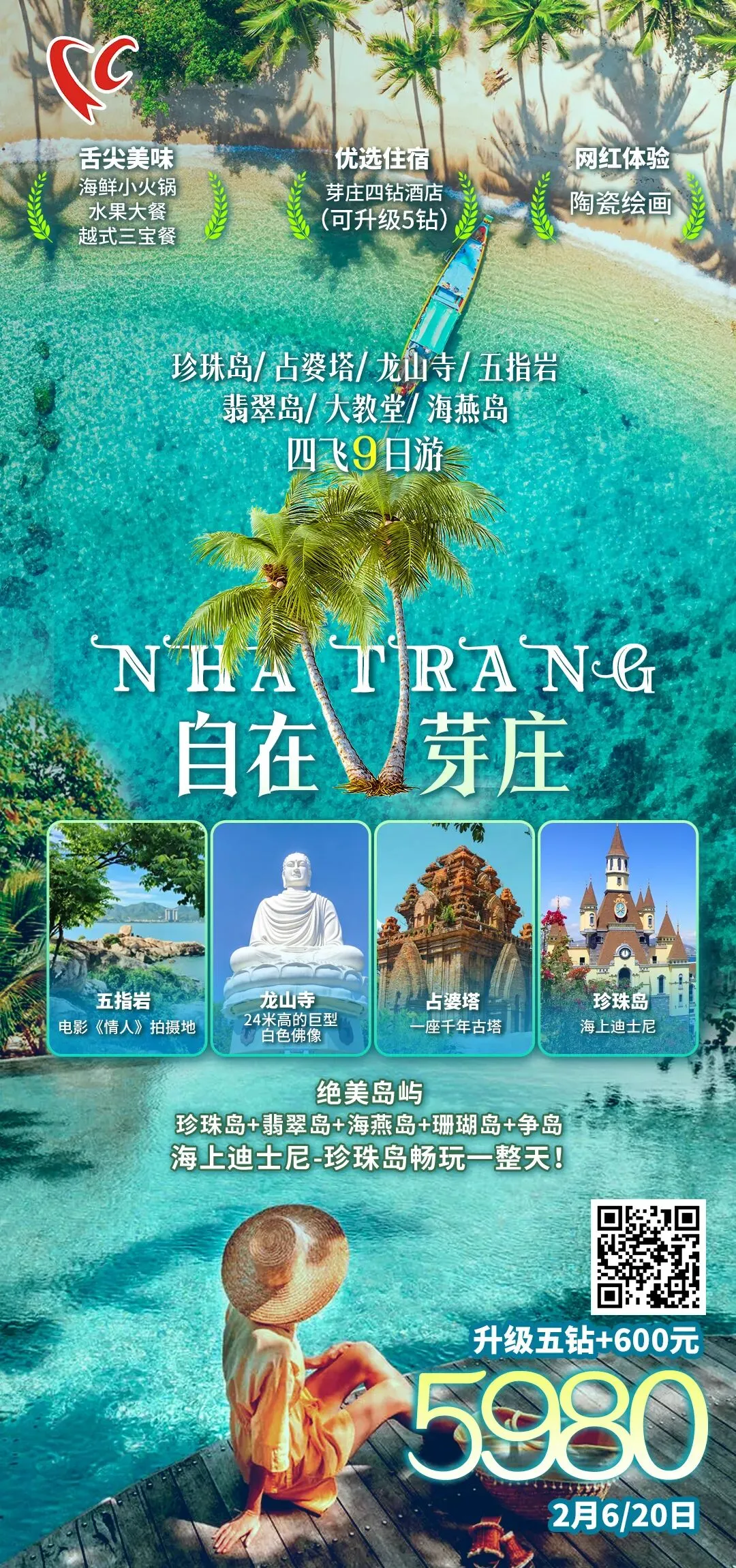 【自在芽庄】占婆塔、翡翠湾、五指岩、三岛联游四飞9日