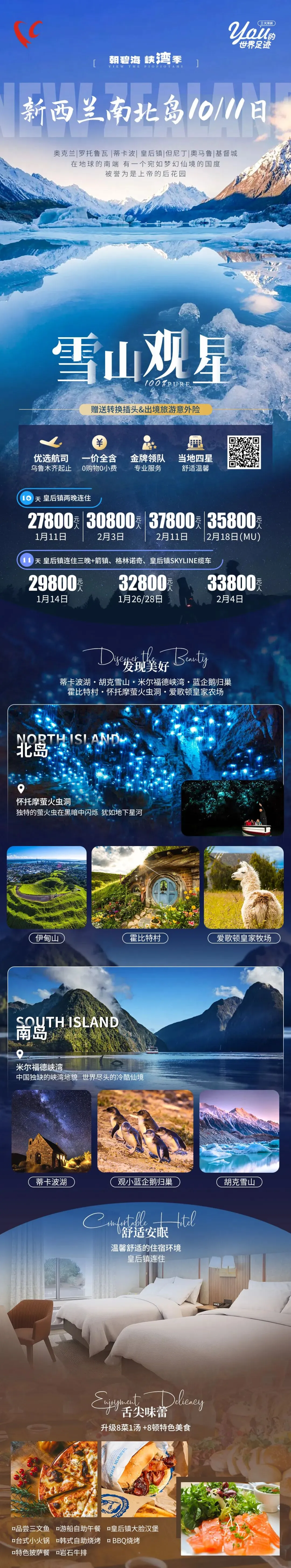 雪山观星系列春节限定升级版---一价全含新西兰南北岛10/11日含米佛峡湾