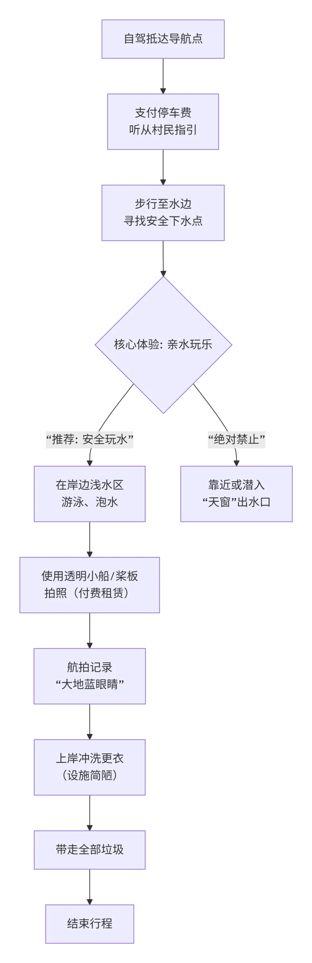 安全是第一原则:水下情况复杂,有深坑、暗流和水草。“窗”口(地下水涌出的深洞)区域极其危险,严禁靠近和潜入。所有活动都应在岸边安全的浅水区。