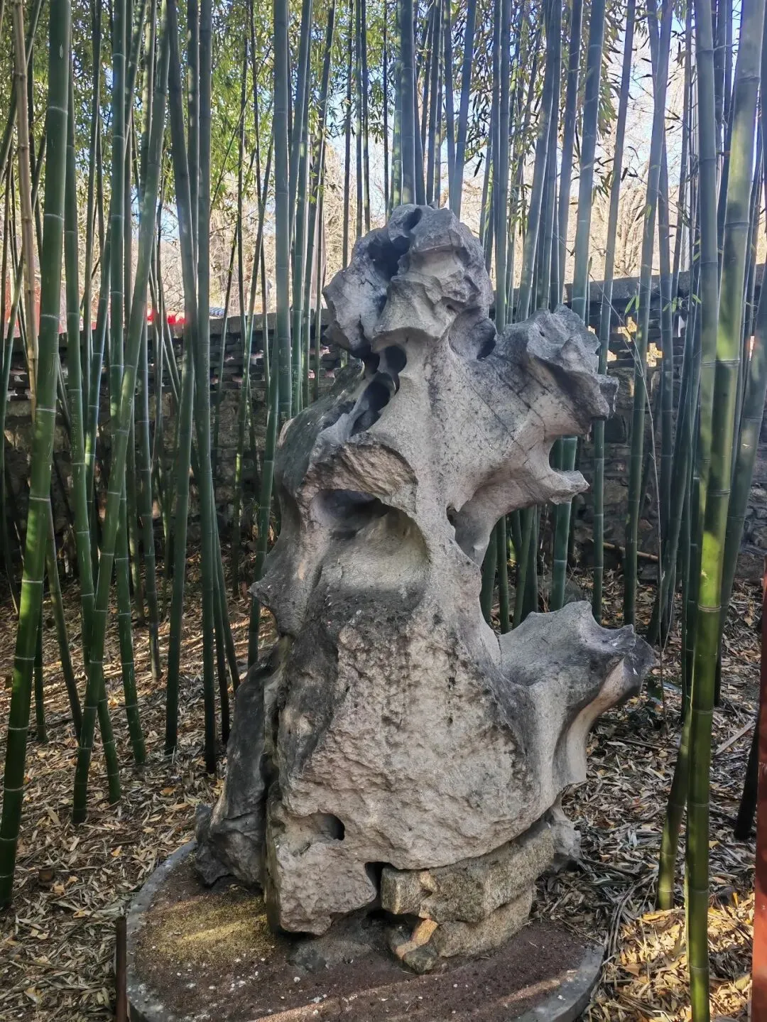 步入其间,在东侧入口处北边,矗立一块造型独特的玲珑石,孔洞嶙峋,似藏着千年的风雨,虽历经岁月剥蚀,依旧傲然挺立。周边翠竹环绕,以柔克刚,仿佛正用生命的绿意点缀着顽石的沧桑,让人叹为观止。