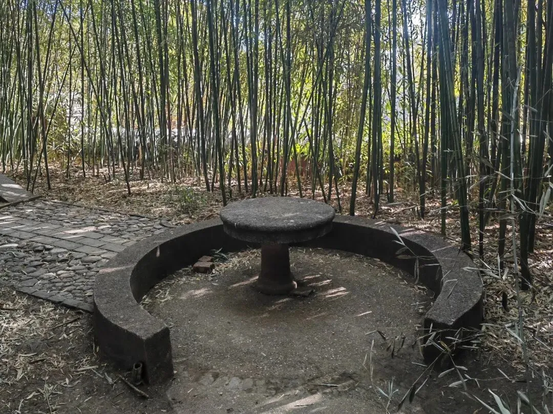 沿竹径西行,不远处的左侧有一方石桌,周边,弧形的围挡环绕,充当石凳,只留下出入口,以最朴素的围合,把满园竹影、清风收进这方小天地,暗合了“入静”的禅理。踏进入口,即从尘俗的喧嚣走向内心的清宁;踏出入口,带着一身竹香,重新融入竹林的幽深,非常有创意的设计。