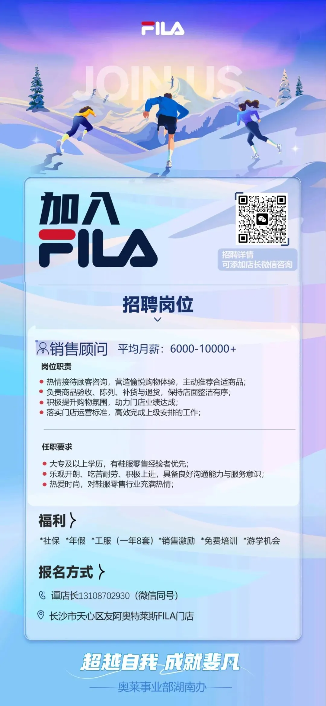 FILA 全职导购招聘:长沙芙蓉南路友阿特莱斯FILA月收入(6000-12000)