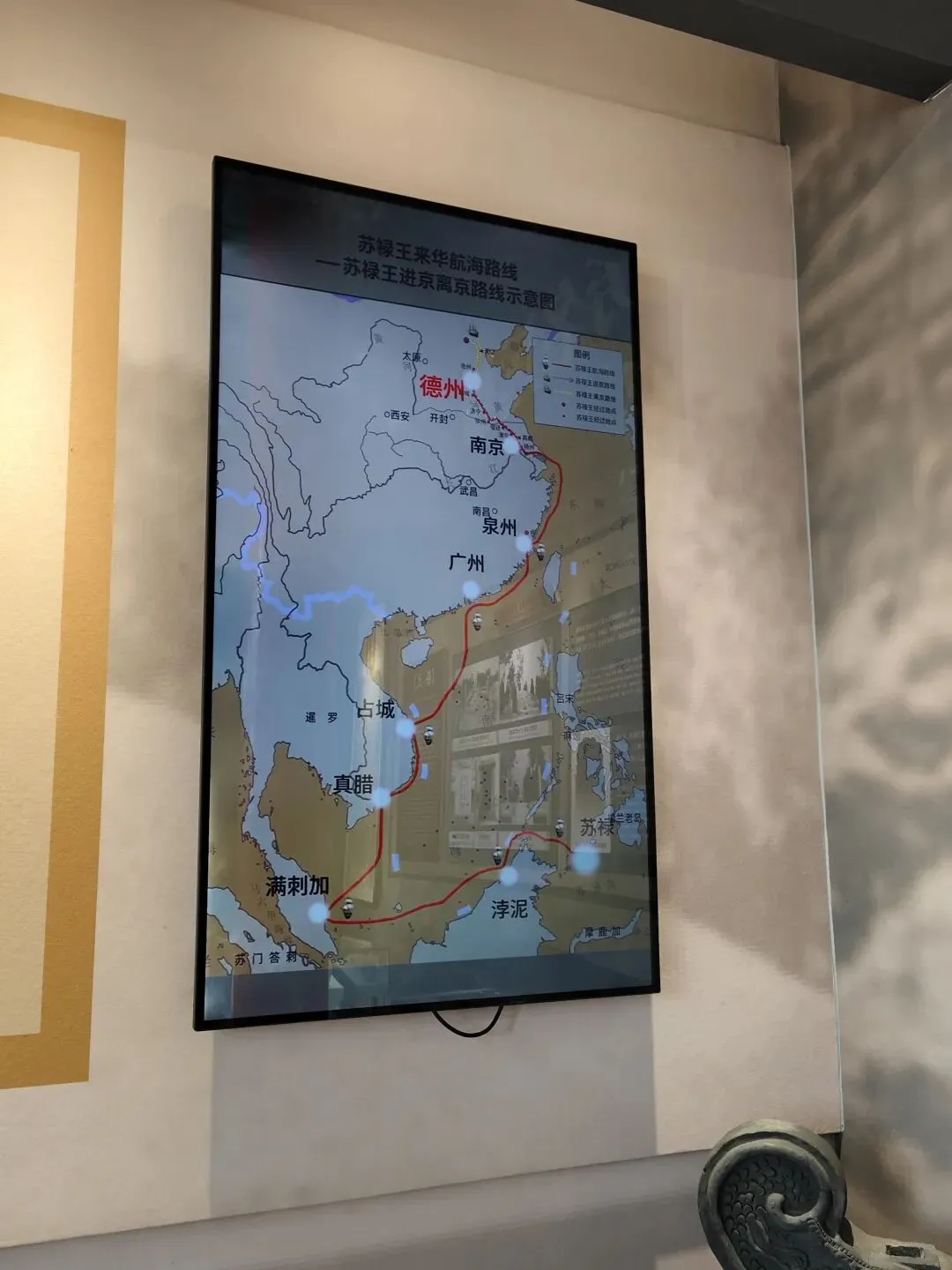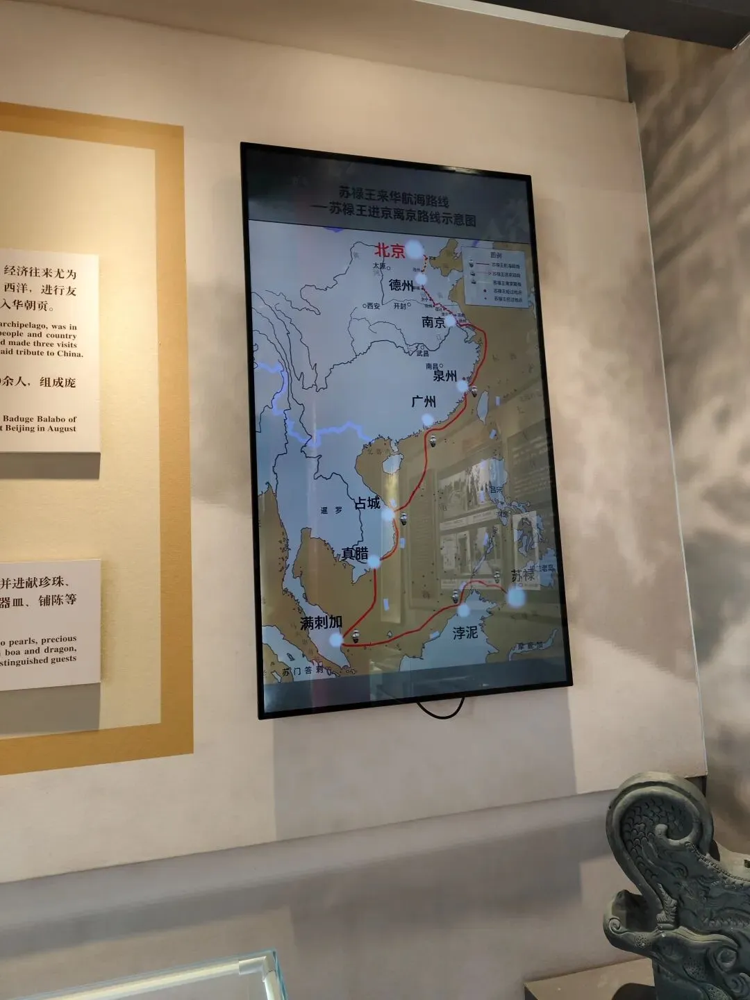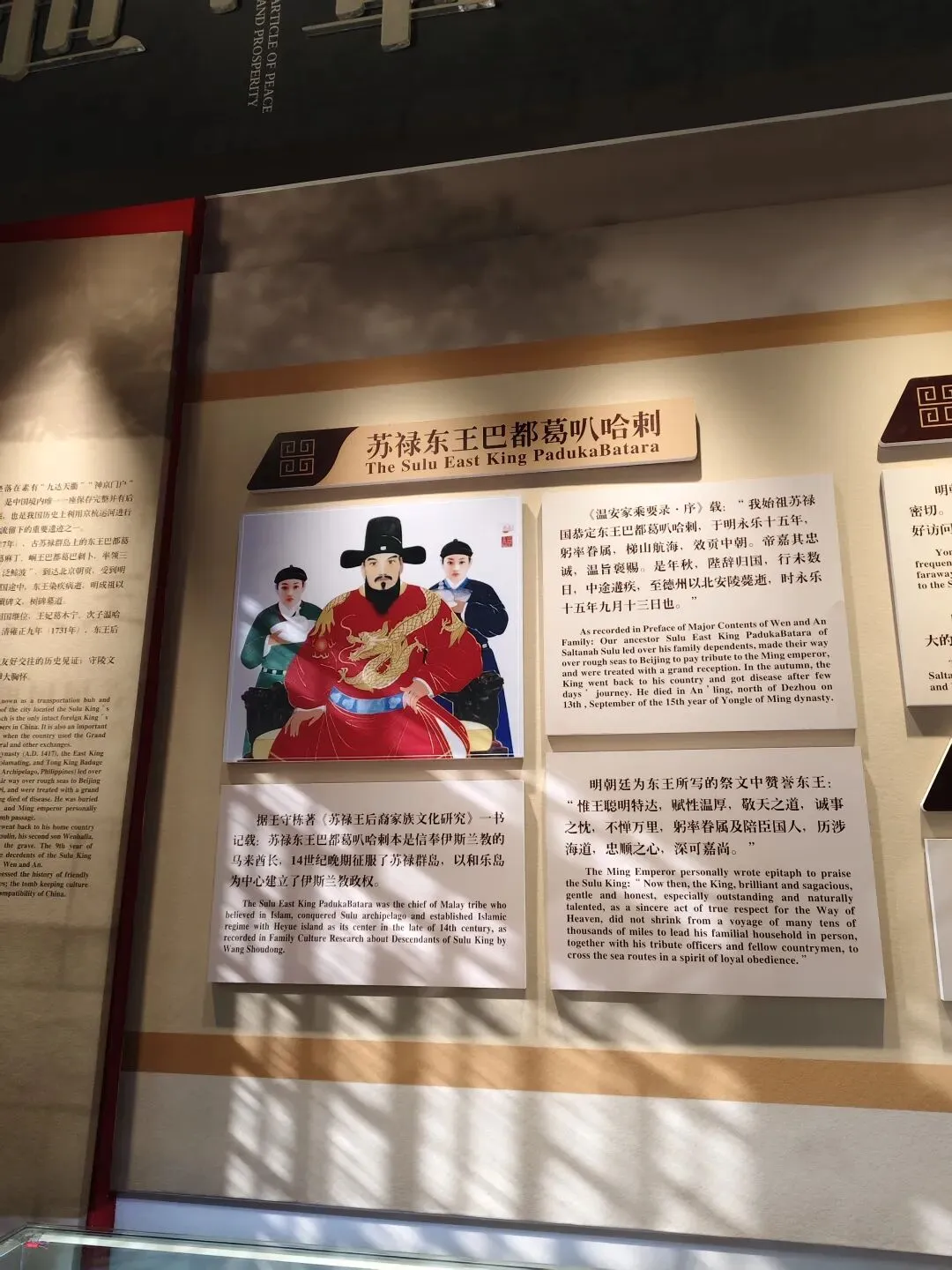 进门参观祾恩殿,东配殿等展区,重温"苏禄王访华"的干古佳话,了解运河文化,海丝文化,以及东王守墓后人融入当地的历程。近距离感受历史交往的鲜活印记。访华路线是动态的,可以仔细观看,而且细节是苏禄东王。 苏禄东王即巴都葛·叭答剌,是苏禄国三位国王中地位最尊者 。