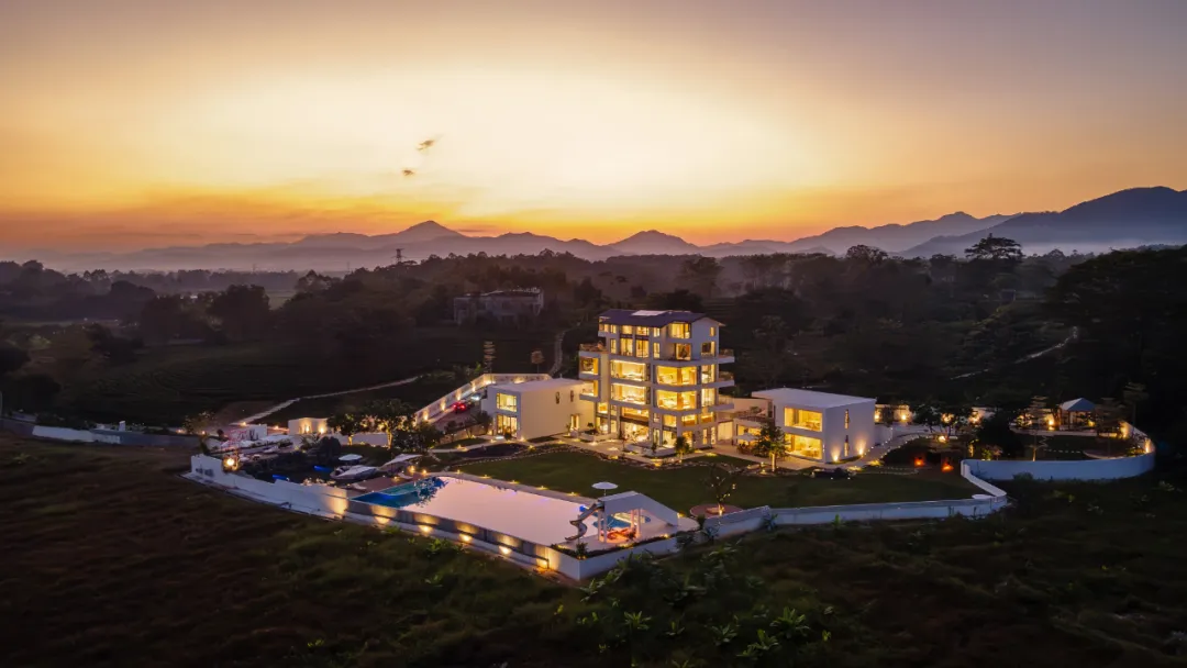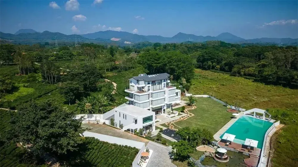 该民宿位于惠州市博罗县高桥村中心园小组 1 号,背靠茶山,毗邻广东十大最美乡村公路柏塘柏邹公路及柏塘古榄园,田园与茶园风情兼具。民宿占地 6600 平方米,独门独院,配套无边泳池、私汤泡池、儿童游乐区、餐厅等设施,白色独栋建筑遗世独立于山野间,屋后可采茶,窗前可泡茶,颇具韵味。