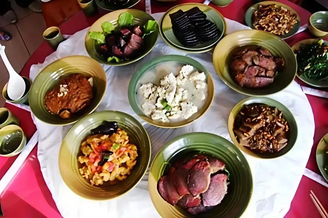 想正经吃一顿,魏家客栈的"八大碗"还行,糟肉蒸得烂,是本地人待客的硬菜。