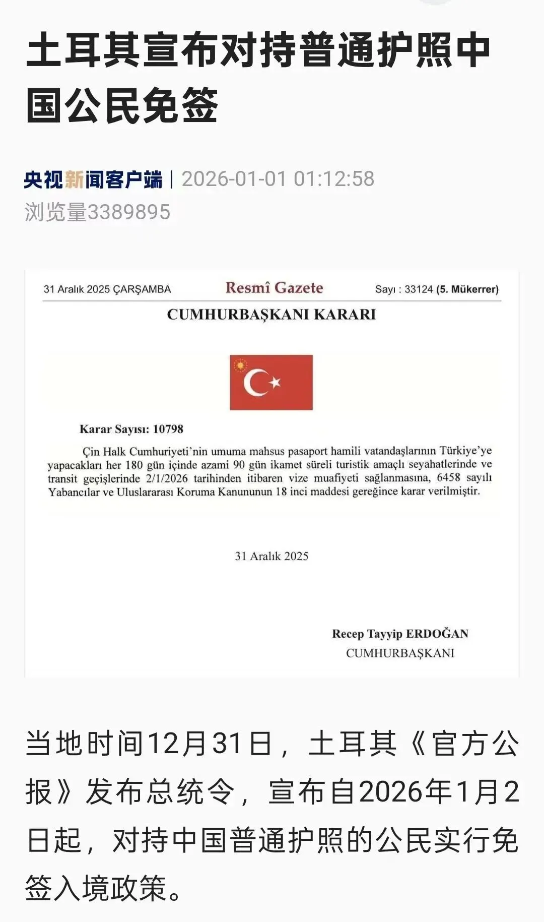 近日,土耳其宣布:自2026年1月2日起,对持普通护照的中国公民实施免签入境政策,180天内最多能停留90天!