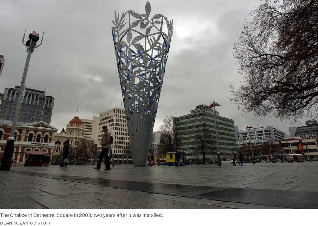 “圣杯”由著名雕塑家Neil Dawson创作,原为纪念新千年及坎特伯雷建省150周年,其最初造价同样为40万纽币。尽管曾有公众对高昂的维修费用表示疑问,但市议会强调,这是由专业工程的技术要求与规模决定的。Dawson本人对此次修复表示赞赏,认为这将确保雕塑在未来25年内保持良好状态并降低维护需求。