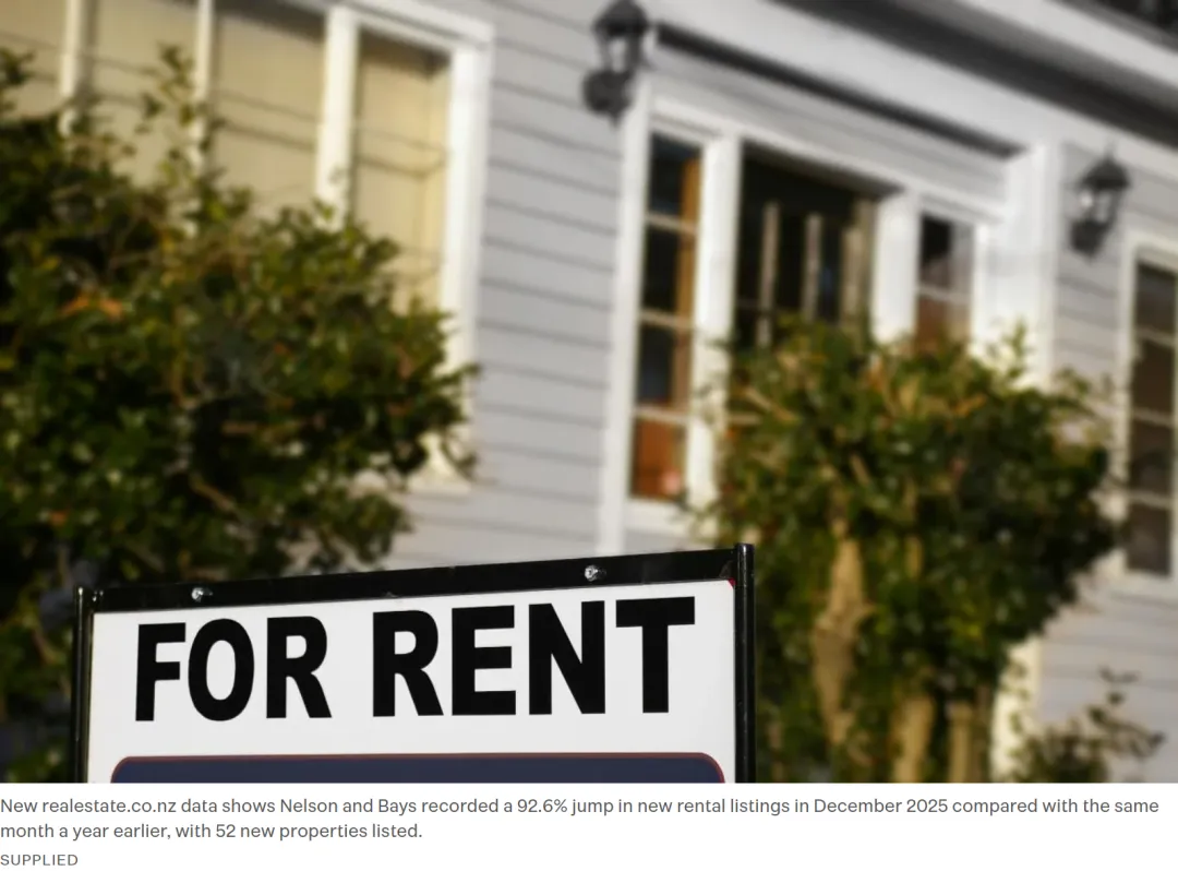 最新数据显示,Nelson和Bays地区租赁市场正出现显著转变,租客在谈判中可能获得更多主动权。根据realestate.co.nz统计,2025年12月该地区的新上市出租房源同比激增92.6%,达到52套,可租房源总数较去年同期也大幅上升。