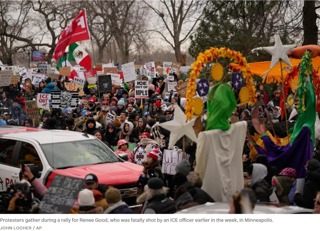 周日,数千名抗议者冒着严寒在明尼阿波利斯(Minneapolis)游行,抗议美国移民与海关执法局(ICE)警员近期在执法行动中开枪导致一名37岁女子死亡的事件。示威者高呼“将ICE赶出明尼苏达”(De-ICE Minnesota)等口号,市长Jacob Frey和州长Tim Walz呼吁和平抗议,同时批评特朗普政府试图制造混乱。