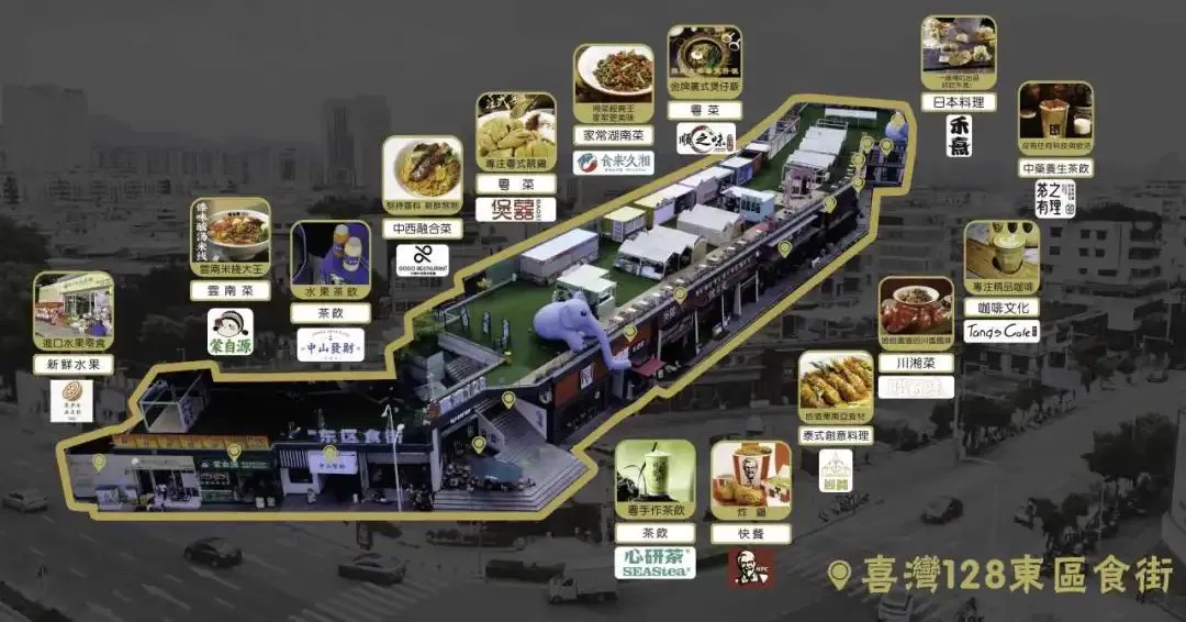 包括喜湾128美食街及周边东裕路的餐饮商户,共有餐饮业态约70家。喜湾128美食街,以其丰富的餐饮业态吸引了无数食客的目光,一层餐饮种类丰富,特色粤菜、异国风情菜系、火锅烤肉等汇聚,二层则构建起一方“夜市新天地”,扑面而来的美食香气,各种网红小吃琳琅满目。作为美食街的标志性广场,喜湾128与东区非遗文化跨界互动,打造了全国首家非遗主题的肯德基起湾金龙文化主题餐厅,还联合心研茶打造起湾金龙文化主题店,传统品味与烟火气的碰撞融合,为消费者带来美食消费新体验;东裕路周边的餐饮商户同样精彩纷呈,既有顺景花园酒店、品小馆、威尼斯西餐厅等热门餐饮场所,也有种类繁多的特色餐饮、饮品简餐、粉面粥铺等星落小店,无论是来自何方的食客,都能在这里找到自己心仪的美食。