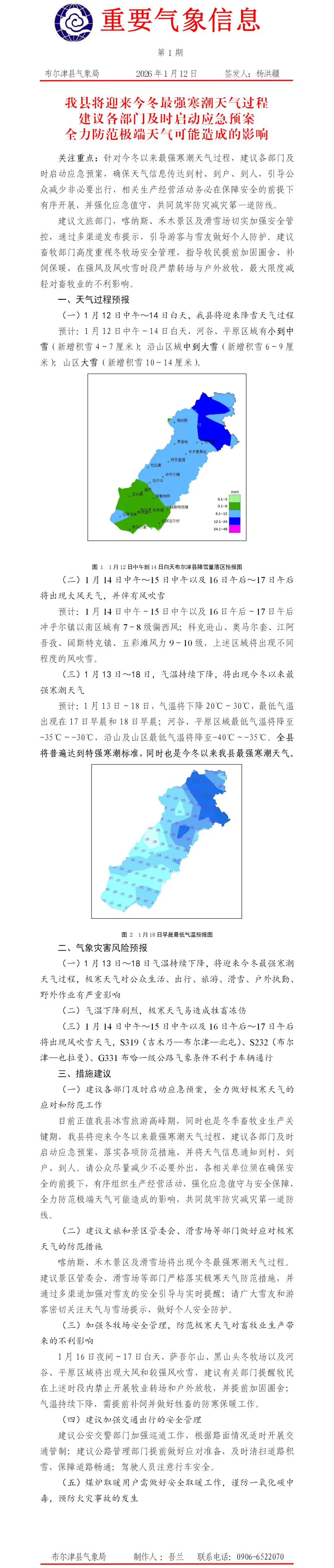 【两公布一提示】喀纳斯景区分局交通管理大队关于降雪降温天气期间、天气预报及交通安全提示一、天气预报: 1月12日中午~14日白天,我县将迎来降雪天气过程。 预计:1月12日中午~14日白天,河谷、平原区域有小到中雪(新增积雪4~7厘米);沿山区域中到大雪(新增积雪6~9厘米);山区大雪(新增10~14厘米)。