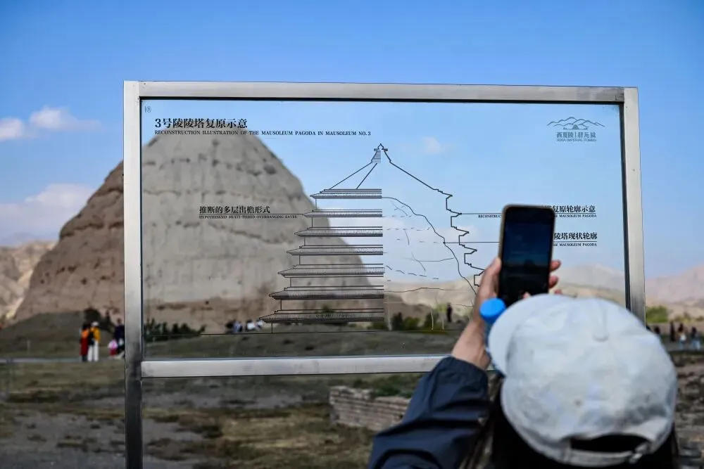 游客透过复原西夏陵陵塔轮廓的亚克力板拍照打卡。新华社记者冯开华 摄如今,别出心裁的展陈设计赋予了遗迹新的生命。在据推测为西夏开国皇帝李元昊陵寝的三号陵,游客可透过勾勒建筑轮廓的透明亚克力板,将之与残存遗迹重合,想象其原有形制;神道旁,镂空金属丝编织出石像生的模样。这些艺术化的呈现方式,成了社交媒体上的热门话题。“这个展现真的很艺术化了,和原有的文物场景或者碎片结合起来,真的很棒。”一条高赞评论写道。
