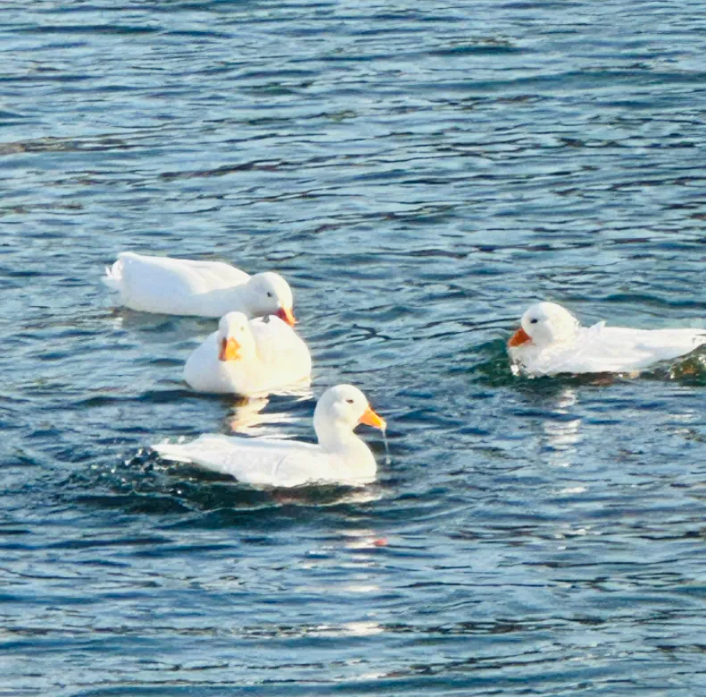 除了腊梅,在湖水中,雪白的小鸭子在冰面上嬉戏。
