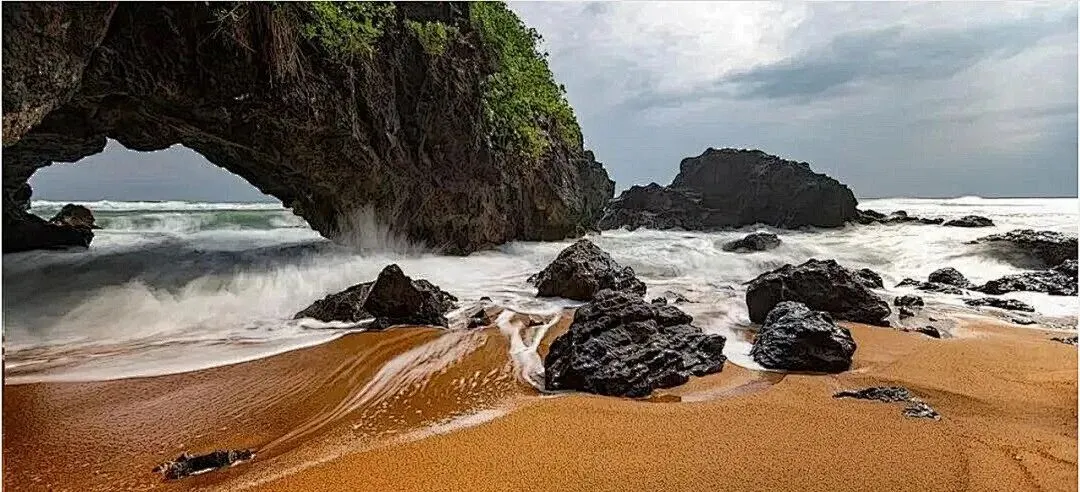 山钦湾以黑色火山礁石和神秘燕子洞著称。退潮时可步入天然岩洞,感受海浪回响;涨潮时礁石被拍打出壮阔浪花。这里的海水湛蓝通透,是浮潜与水下摄影的好去处,也是摄影师追逐日出日落剪影的热门机位。